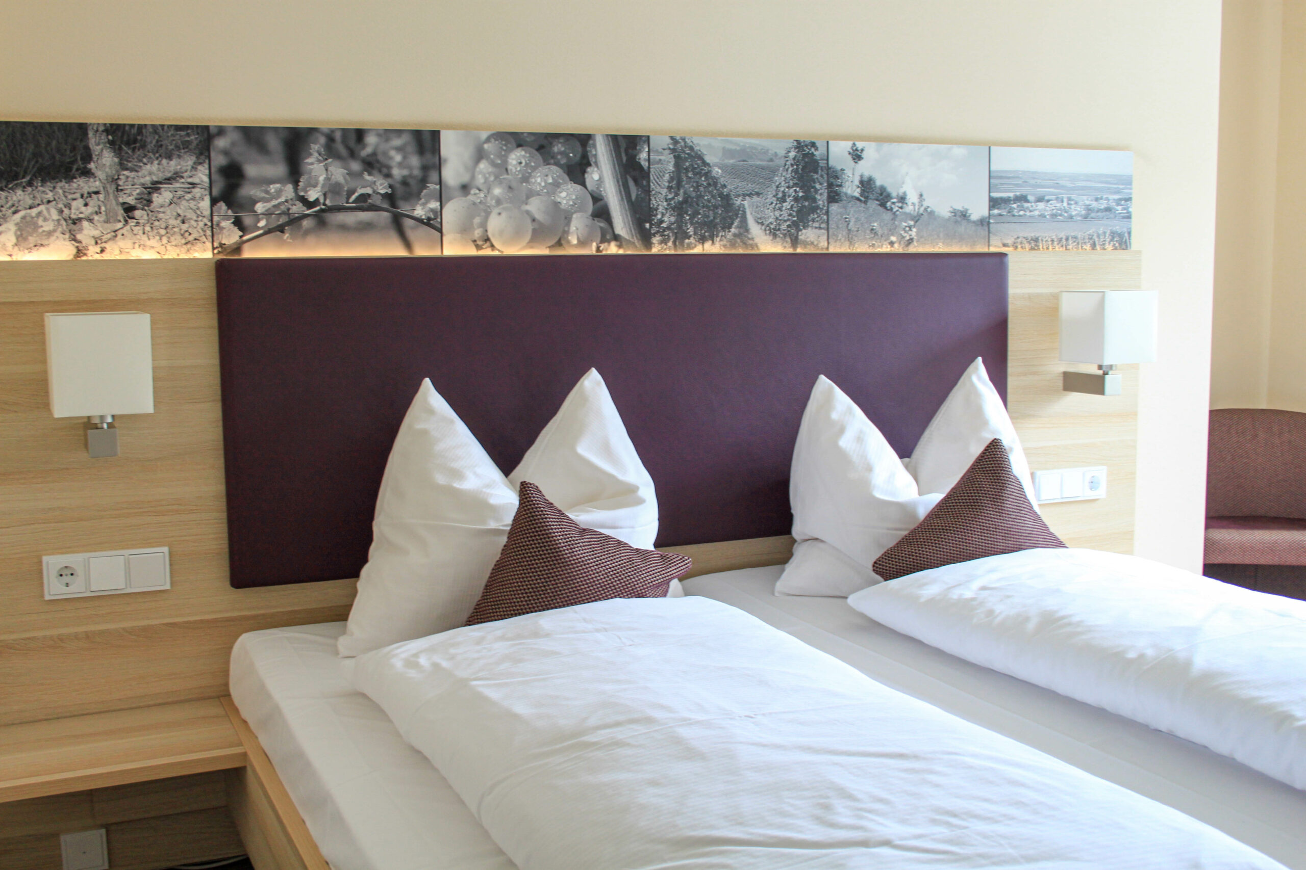 Wenn die Cuvées zusammengestellt werden, probieren selbstverständlich alle vier gemeinsam. 16 Hektar Rebfläche bewirtschaftet die Familie – überwiegend Weißweine wie Riesling, Grauburgunder und Sauvignon Blanc. Rotweinsorten wie Spätburgunder und Cabernet Sauvignon nehmen 40 % der Fläche ein. Aber die Gäste fragen weniger nach Rebsorten, eher nach dem Geschmackstyp. Deshalb sind die beliebten Cuvées nach Stimmungen benannt: „Feierlaune“ heißt der Weißwein aus Riesling, Scheurebe und Muskateller – „Sommermagie“ die Rosé Variante. „Kaminfeuer“ ist der vielversprechende Name der Rotwein Cuvée aus der heimischen Sorte Spätburgunder und der internationalen Sorte Merlot. Ergänzend zu den Wein Events richtete die Familie 2014 elf Gästezimmer ein – alle mit der für das Weingut prägenden Akzentfarbe Lila.