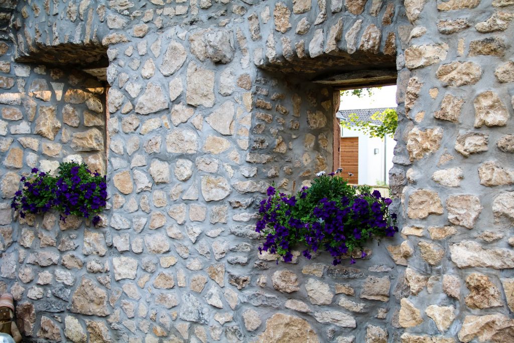 Terwijl de rondleiding verder gaat, volgen we de gebrandschilderde muur. Margret laat zien dat veel huizen pal tegen de stadsmuur werden gebouwd. Voor de bouw van huizen waren in die tijd dus maar drie muren nodig. Waar muurhuizen werden afgebroken, zien we hier en daar nog een schijnbaar willekeurig raam of doorgang in de gebrandschilderde muur. Margret merkt met een twinkeling in haar ogen op: "In Rheinhessen is niet alles wat het lijkt!"