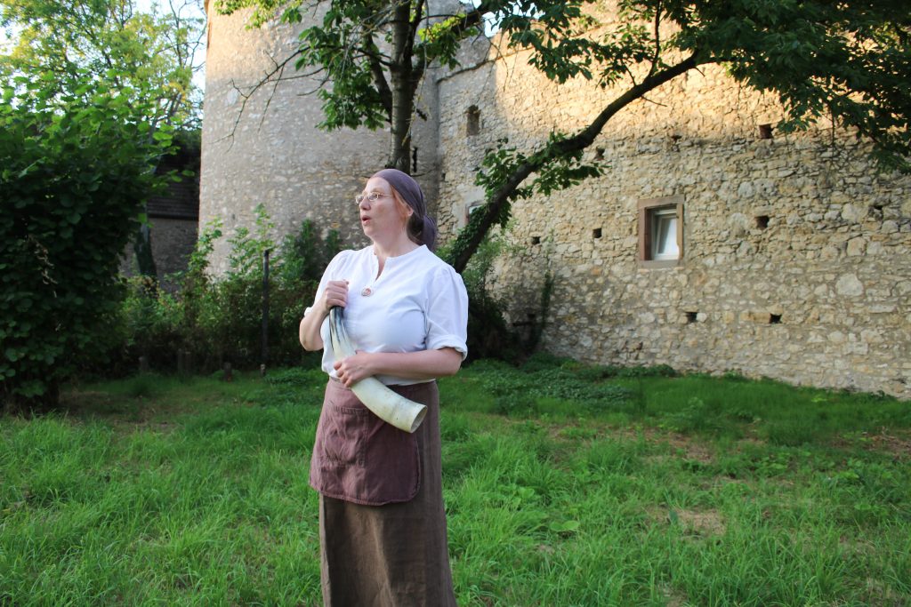 We bereiken de heksentoren aan de westkant van de muur. Hier moet Margret de uren zingen. Speciaal hiervoor heeft ze de hoorn van haar grootvader meegenomen. Met een klein liedje kondigt ze de huidige tijd aan.
